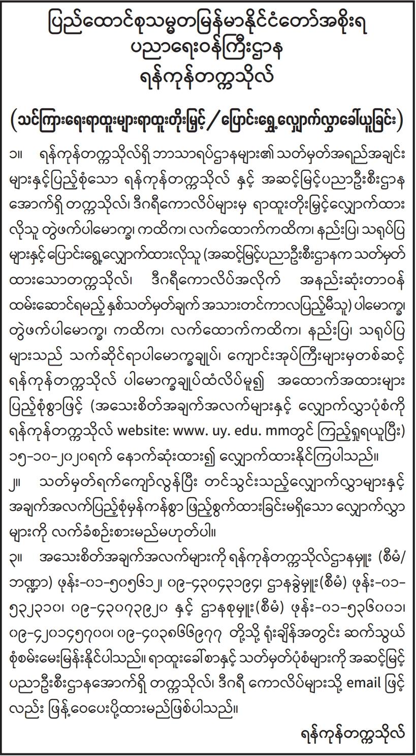ရန်ကုန်တက္ကသိုလ် (သင်ကြားရေးရာထူးများ ရာထူးတိုးမြှင့်/ပြောင်းရွှေ့ လျှောက်လွှာခေါ်ယူခြင်း)