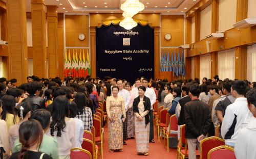 Firstly, the Union Minister said that she was delighted that the Naypyitaw State Academy is conducting student-centered approach, project-based learning, and library-based learning; and encouraged ongoing dedication and effort. Moreover, she stated that as civil servants of the country, faculty members and staff should strive to continuously improve their personal qualities in accordance with the motto “Good civil servants make a good nation,” and that as the Government is providing support and fulfilling the needs of civil servants to the utmost best, civil servants must serve the country loyally as good staff. Furthermore, she said that it is necessary to correctly cast vote for representatives who can truly serve the country in the upcoming multi-party democratic general election.