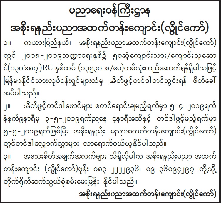 အစိုးရနည်းပညာ အထက်တန်းကျောင်း(လွိုင်ကော်) အိတ်ဖွင်တင်ဒါတင်သွင်းရန် ဖိတ်ခေါ်ခြင်း Type: တင်ဒါကြေညာချက်များ