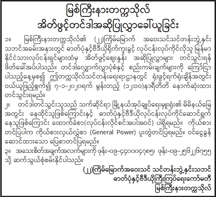 မြစ်ကြီးနားတက္ကသိုလ် အိတ်ဖွင့်တင်ဒါ အဆိုပြုလွှာခေါ်ယူခြင်း