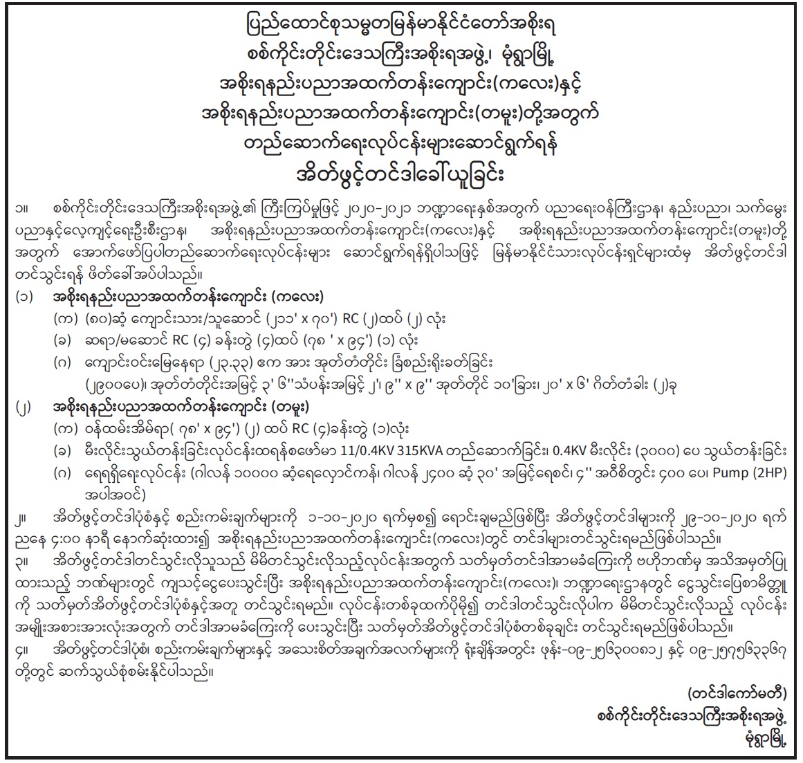 အစိုးရနည်းပညာအထက်တန်းကျောင်း(ကလေး)နှင့် အစိုးရနည်းပညာအထက်တန်းကျောင်း(တမူး)တို့အတွက် တည်ဆောက်ရေးလုပ်ငန်းများဆောင်ရွက်ရန် အိတ်ဖွင့်တင်ဒါခေါ်ယူခြင်း Type: တင်ဒါကြေညာချက်များ