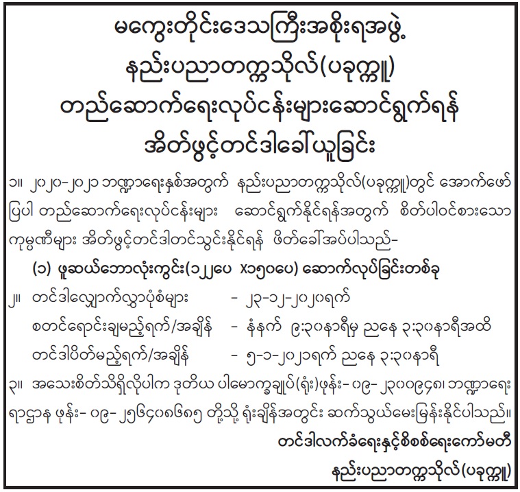 နည်းပညာတက္ကသိုလ်(ပခုက္ကူ) တည်ဆောက်ရေးလုပ်ငန်းများဆောင်ရွက်ရန် အိတ်ဖွင့်တင်ဒါခေါ်ယူခြင်း Type: တင်ဒါကြေညာချက်များ