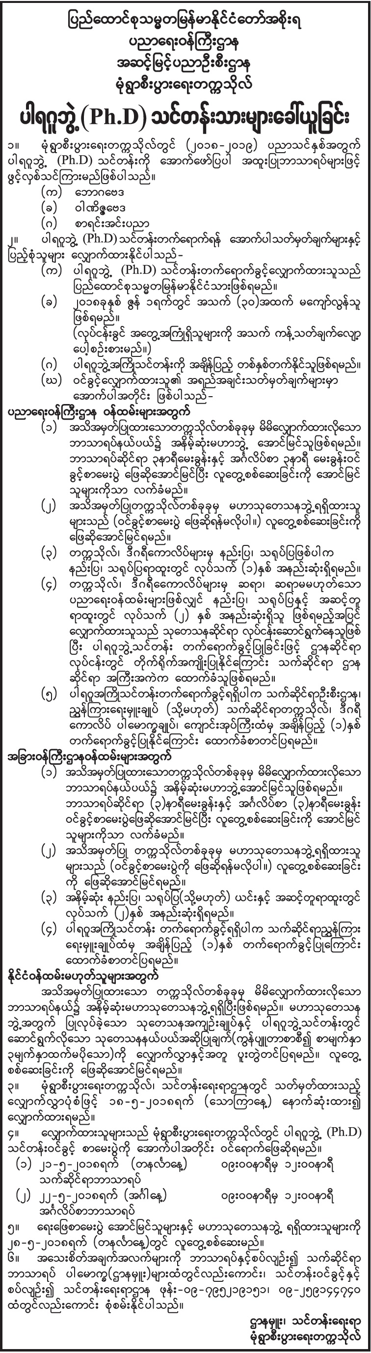 မုံရွာစီးပွားရေးတက္ကသိုလ် ပါရဂူဘွဲ့သင်တန်းသားများ ခေါ်ယူခြင်း