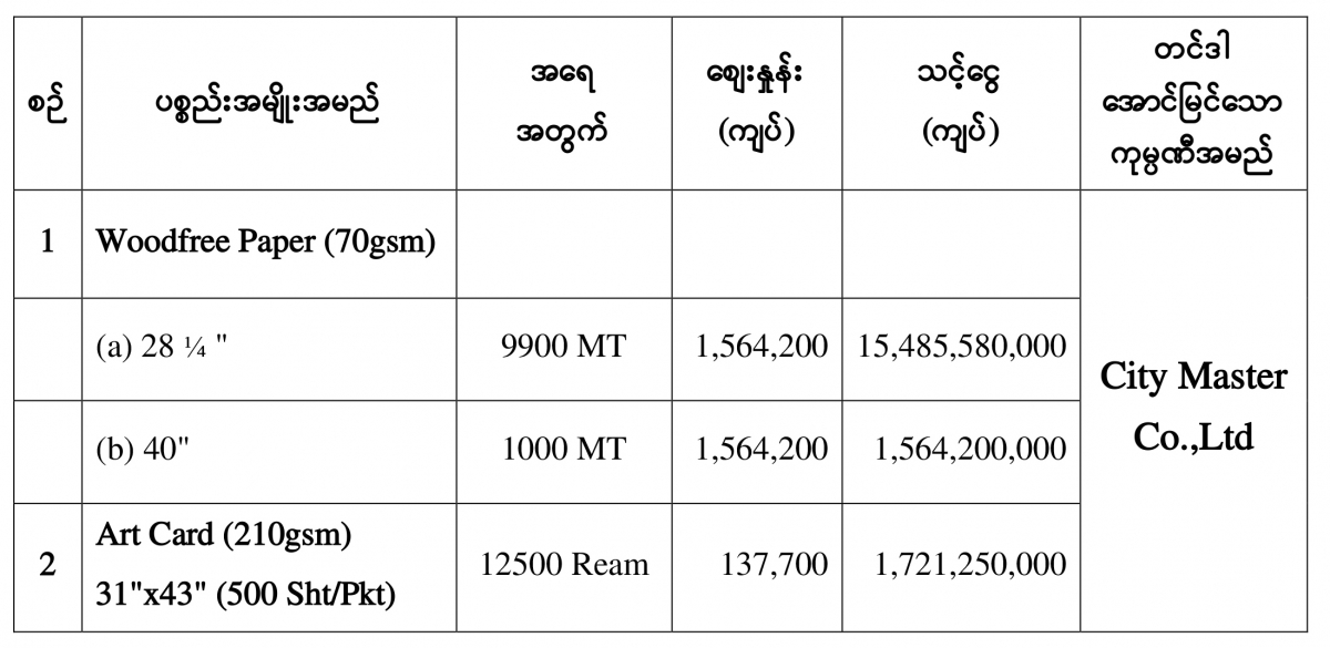 ပြန်ကြားရေးဝန်ကြီးဌာန၊ ပုံနှိပ်ရေးနှင့်ထုတ်ဝေရေးဦးစီးဌာနမှ (၁၁-၁၀-၂ဝ၁၈)ရက်နေ့၊ (၁၅ဝဝ)နာရီ အချိန်တွင် ပြန်ကြားရေးဝန်ကြီးဌာန၊ ဝန်ကြီးရုံးစုဝေးခန်းမ၌ ကျင်းပပြုလုပ်သော ၂ဝ၁၈-၂ဝ၁၉ ဘဏ္ဍာနှစ် (၂၀၁၉-၂၀၂၀ ပညာသင်နှစ်) ကျောင်းသုံးဖတ်စာအုပ်များ ရိုက်နှိပ်ရန် အတွက် သာမန်အသုံးစရိတ်ဖြင့် စက္ကူ (၂)မျိုးအား ဝယ်ယူရန် ကုန်ကြမ်းပစ္စည်းများဝယ်ယူရေးနှင့် စိစစ်ရေးကော်မတီမှ ဈေးနှုန်းစိစစ်ခဲ့ရာ တင်ဒါအောင်မြင်ခဲ့သော အောက်ပါကုမ္ပဏီမှ ယှဉ်တွဲပါဈေးနှုန်းနှင့်အရေအတွက်ဖြင့် တင်ဒါအောင်မြင်ကြောင်း ကြေညာအပ်ပါသည-