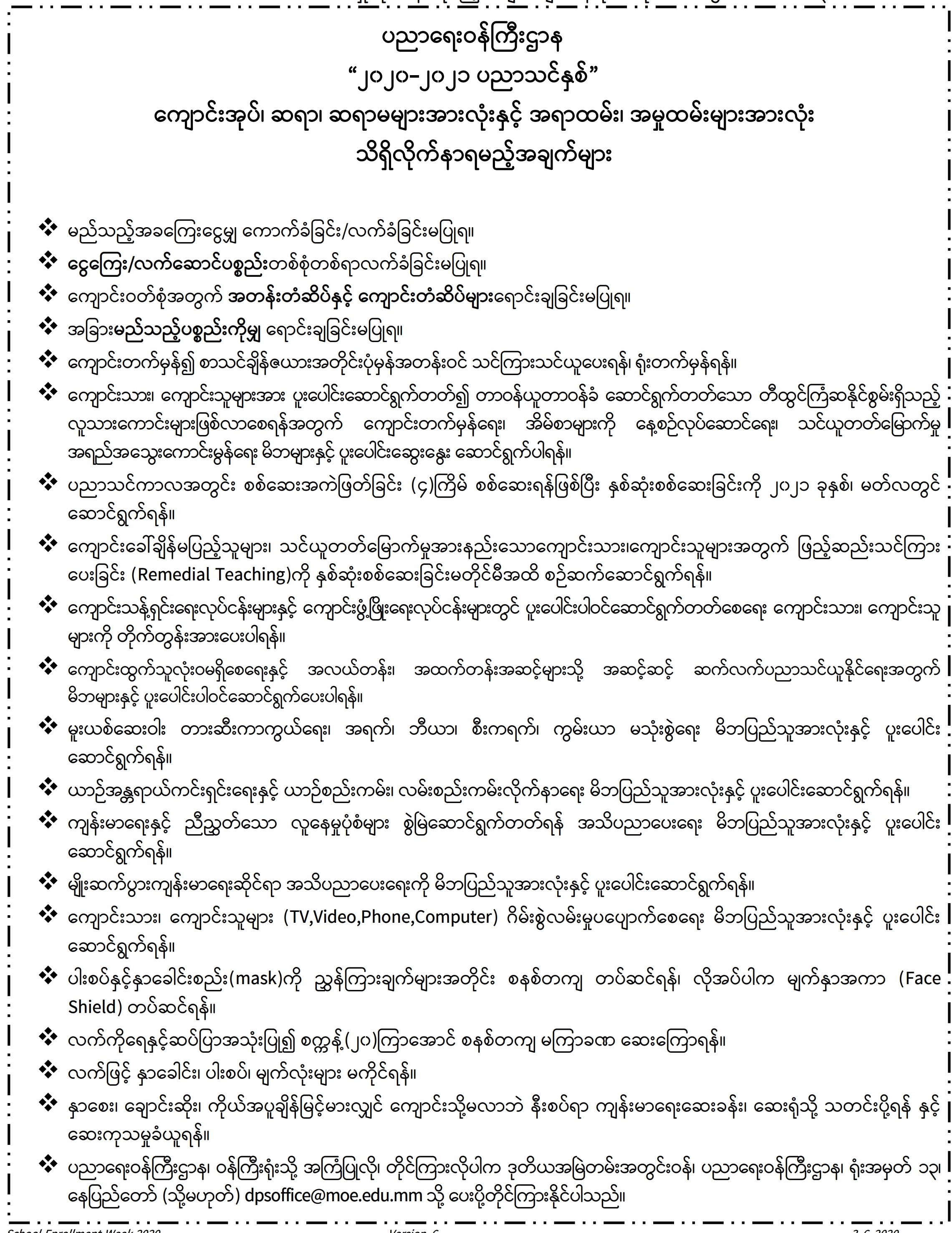 ကျောင်းအုပ်၊ ဆရာ၊ ဆရာမများအားလုံးနှင့် အရာထမ်း၊ အမှုထမ်းများအားလုံး သိရှိလိုက်နာရမည့်အချက်များ
