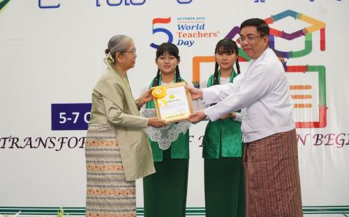 ယင်းနောက် ဒုတိယဝန်ကြီး ဒေါက်တာဇော်မြင့်က ထူးချွန်ဆုရရှိသည့် ဆရာကြီး၊ ဆရာမကြီးများကိုလည်းကောင်း၊ ဒုတိယဝန်ကြီး ဦးဇော်ဝင်းက ၂၀၂၂ ခုနှစ် ကမ္ဘာ့ဆရာများနေ့ အထိမ်းအမှတ် အဆင့်မြင့်ပညာအဆင့် ဆရာဆရာမများ ဆောင်းပါးပြိုင်ပွဲတွင် ဆုရရှိသူများကိုလည်းကောင်း ဆုချီးမြှင့်သည်။