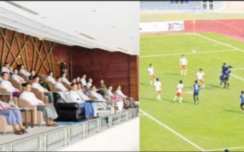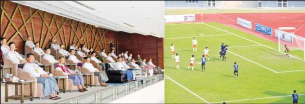 ဦးစွာ နိုင်ငံတော်စီမံအုပ်ချုပ်ရေး ကောင်စီဒုတိယဥက္ကဋ္ဌ ဒုတိယဝန်ကြီးချုပ်နှင့် တက်ရောက်လာကြသူများသည် (၂၀၂၂-၂၀၂၃) ပညာသင်နှစ် တက္ကသိုလ်၊ ဒီဂရီကောလိပ်ပေါင်းစုံ ဘောလုံး (အမျိုးသား) ပြိုင်ပွဲ ဗိုလ်လုပွဲစဉ်အဖြစ် ရန်ကုန်ဇုန်အသင်းနှင့် ပုသိမ်ဇုန်အသင်းတို့ ယှဉ်ပြိုင်မှုများကို ကြည့်ရှုအားပေးကြသည်။