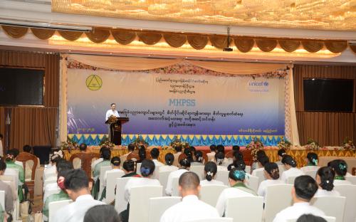 အခြေခံပညာကျောင်းများတွင် စိတ်ပိုင်းဆိုင်ရာ ကျန်းမာရေး၊ စိတ်လူမှုဆက်ဆံရေး အထောက်အပံ့ပေးရေး ဗဟိုအဆင့်သင်တန်းဖွင့်ပွဲအခမ်းအနားကို ယနေ့နံနက်ပိုင်းတွင် နေပြည်တော် မင်္ဂလာသီရိဟိုတယ်ခန်းမ၌ ကျင်းပရာ ပညာရေးဝန်ကြီးဌာန ဒုတိယဝန်ကြီး ဒေါက်တာဇော်မြင့်၊ ပညာရေးဝန်ကြီးဌာနရှိ ဦးစီးဌာနများမှ ညွှန်ကြားရေးမှူးချုပ်များ၊ ဒုတိယအမြဲတမ်းအတွင်းဝန်များ၊ ဒုတိယညွှန်ကြားရေးမှူးချုပ်များ၊ ညွှန်ကြားရေးမှူးများ၊ UNICEF Myanmar မှ တာဝန်ရှိသူများ၊ သင်တန်းနည်းပြများနှင့် တိုင်းဒေသကြီးနှင့်ပြည်နယ်ရှိ အခြေခံပညာရုံးများ၊ ကျောင်းများမှ အရာထမ်းသင်တန်းသား သင်တန်းသူများနှင့် တာဝန်ရှိသူများ တက်ရောက်ကြသည်။