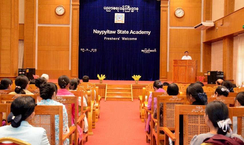 Naypyitaw State Academy ၏ ၂၀၂၃ - ၂၀၂၄ ပညာသင်နှစ် မောင်မယ်သစ်လွင်ကြိုဆိုပွဲ အခမ်းအနားကို ယနေ့မွန်းလွဲ ၁ နာရီတွင် အဆိုပါတက္ကသိုလ်ရှိ ဘက်စုံသုံးခန်းမ၌ ကျင်းပရာ ပညာရေးဝန်ကြီးဌာန ပြည်ထောင်စုဝန်ကြီး ဒေါက်တာညွန့်ဖေ၊ ဒုတိယဝန်ကြီး ဒေါက်တာဇော်မြင့်နှင့် ဒေါက်တာမိုးဇော်ထွန်း၊ အမြဲတမ်းအတွင်းဝန်၊ ညွှန်ကြားရေးမှူးချုပ်များ၊ ဒုတိယညွှန်ကြားရေးမှူးချုပ်များ၊ Naypyitaw State Academy ၏ ဒုတိယပါမောက္ခချုပ်များ၊ ပါမောက္ခ(ဌာနမှူး)များ၊ ဆရာ ဆရာမများ၊ မောင်မယ်သစ်လွင်ကျောင်းသား ကျောင်းသူများနှင့် တာဝန်ရှိသူများ တက်ရောက်ကြသည်။
