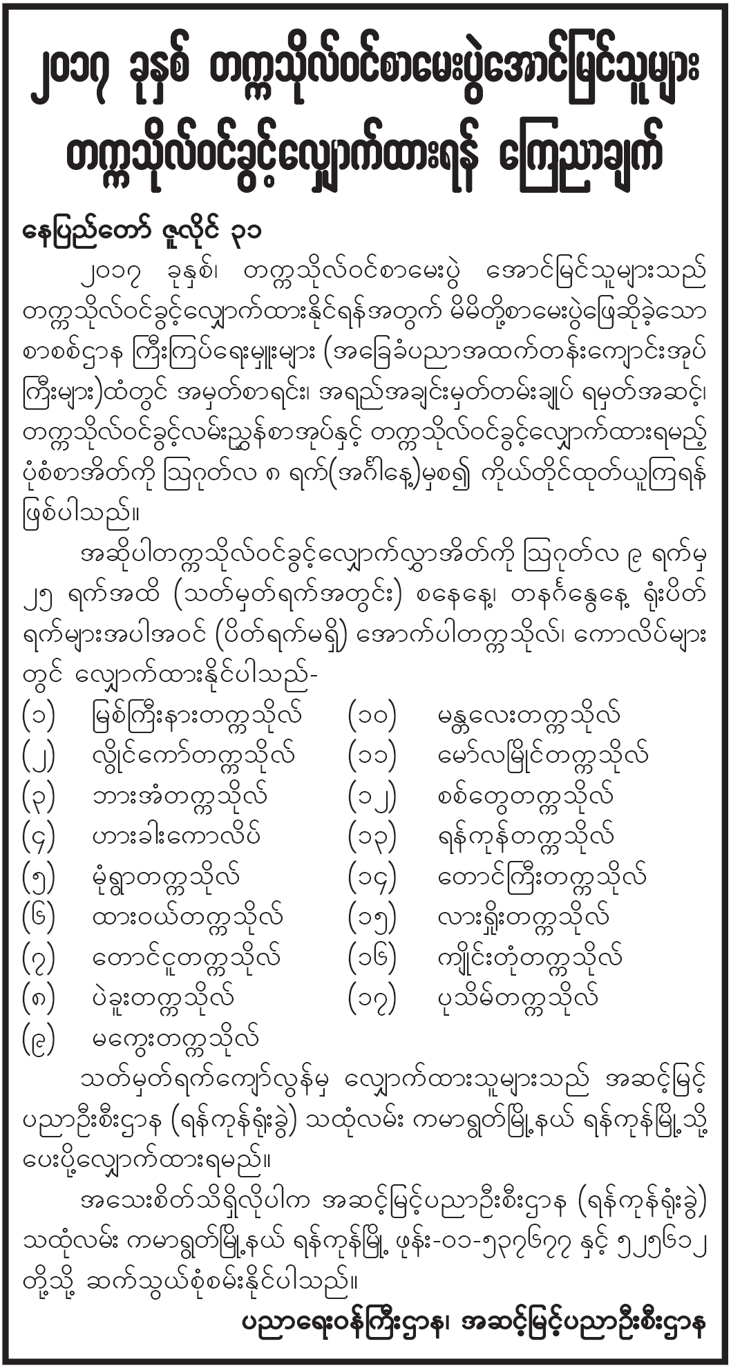 ၂၀၁၇ခုနှစ် တက္ကသိုလ်ဝင်စာမေးပွဲ အောင်မြင်သူများ တက္ကသိုလ်ဝင်ခွင့် လျှောက်ထားရန် ကြေညာချက်