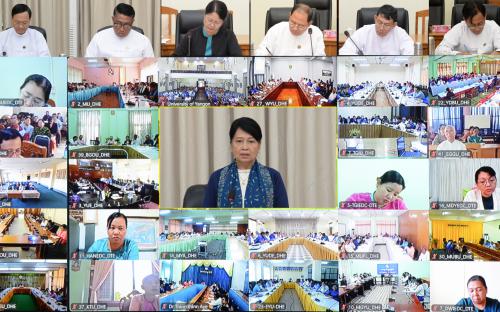 Present at the meeting were the Deputy Ministers Dr. Zaw Myint and U Nay Myo Hlaing, Director Generals, Deputy Permanent Secretaries, and Deputy Director Generals. The rectors, principals, pro-rectors, and professors from universities and degree colleges joined via online.