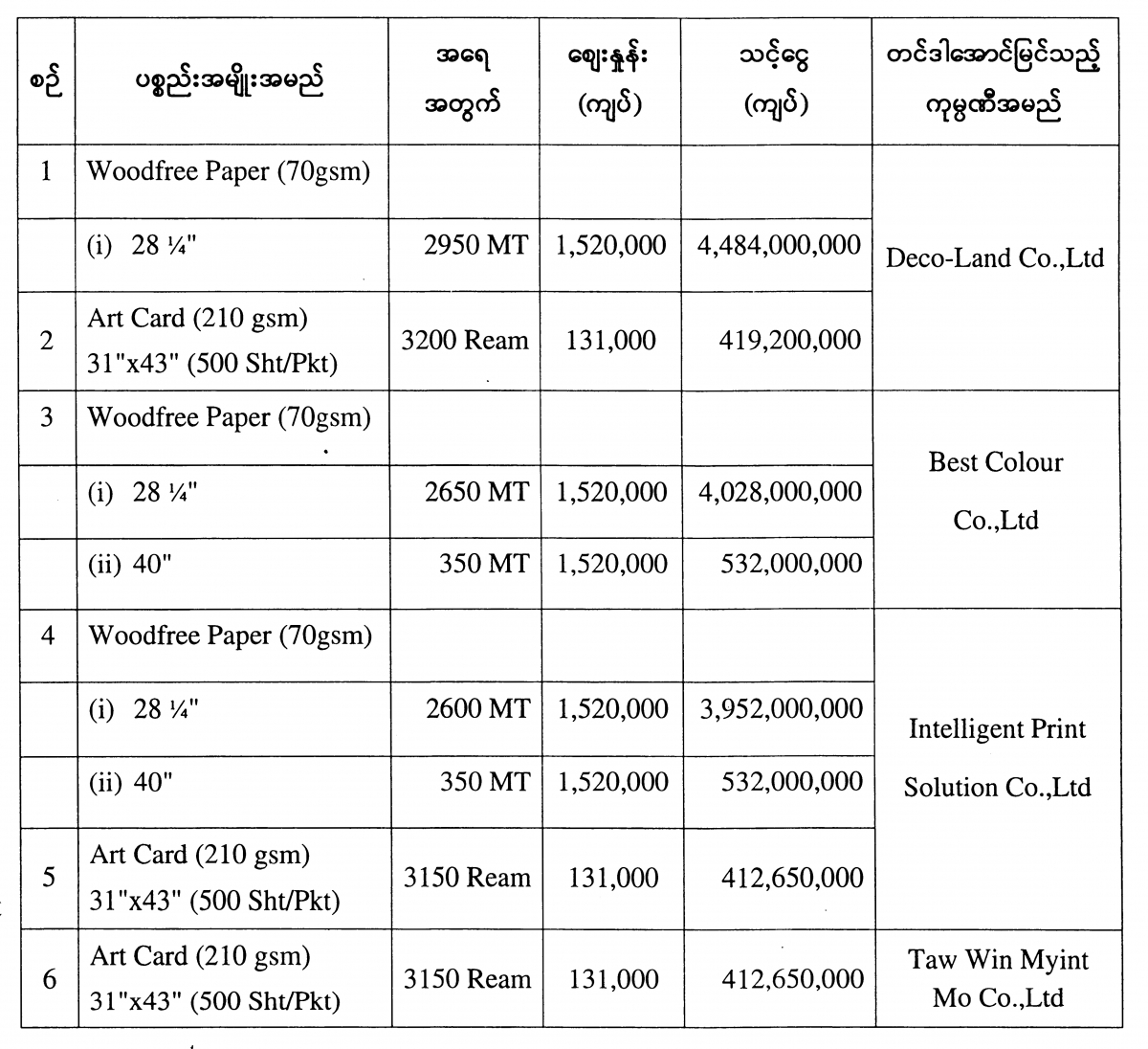 ပြန်ကြားရေးဝန်ကြီးဌာန၊ ပုံနှိပ်ရေးနှင့် ထုတ်ဝေရေးဦးစီးဌာနမှ ၃-၁-၂၀၁၉ ရက်နေ့၊ (၁၃:၀၀)နာရီ အချိန်တွင် ပြန်ကြားရေးဝန်ကြီးဌာန၊ ဝန်ကြီးရုံးစုဝေးခန်းမ၌ ကျင်းပပြုလုပ်သော ၂၀၁၈-၂၀၁၉ ဘဏ္ဍာနှစ် (၂၀၁၉-၂၀၂၀ ပညာသင်နှစ်) ကျောင်းသုံးဖတ်စာအုပ်များ ရိုက်နှိပ်ရန်အတွက် သာမာန်အသုံးစရိတ်ဖြင့် ကုန်ကြမ်းစက္ကူ (၂)မျိုးအား ဝယ်ယူရန် ကုန်ကြမ်းပစ္စည်းများ ဝယ်ယူရေးနှင့် စိစစ်ရေးကော်မတီမှ ဈေးနှုန်း စိစစ်ခဲ့ရာ တင်ဒါအောင်မြင်ခဲ့သော ကုမ္ပဏီများမှ ယှဉ်တွဲပါဈေးနှုန်းနှင့် အရေအတွက်ဖြင့် တင်ဒါအောင်မြင်ကြောင်း ကြေညာအပ်ပါသည်-