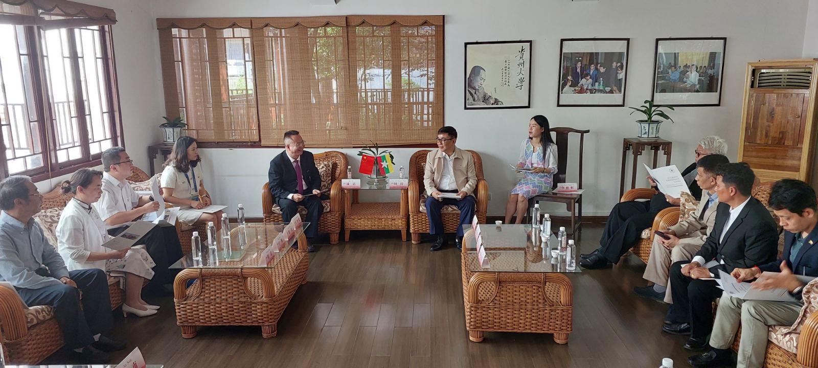 တရုတ်ပြည်သူ့သမ္မတနိုင်ငံ ကွေ့ကျိုးပြည်နယ် ကွေ့ရမ်မြို့တွင် ရောက်ရှိနေသော ပြည်ထောင်စုဝန်ကြီး ဒေါက်တာညွန့်ဖေ ဦးဆောင်သော မြန်မာကိုယ်စားလှယ်အဖွဲ့သည် ယနေ့နံနက်ပိုင်းက ကွေ့ကျိုးတက္ကသိုလ် (Guizhou University)သို့ သွားရောက်လေ့လာရာ တက္ကသိုလ်မှတာဝန်ရှိသူများက တက္ကသိုလ်ရှိ စာကြည့်တိုက်၊ လက်တွေ့ခန်းများ၊ တက္ကသိုလ် သမိုင်းပြတိုက်နှင့် တက္ကသိုလ်အတွင်း လိုက်လံရှင်းလင်းပြသကြသည်။