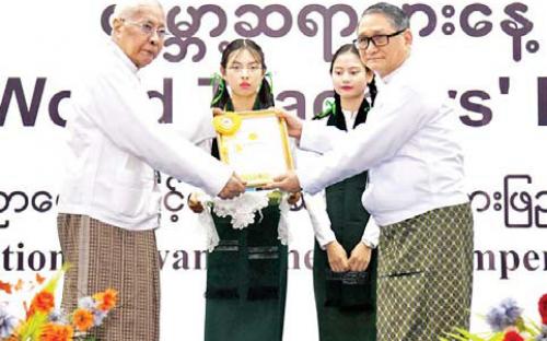ဆက်လက်၍ ဒုတိယဝန်ကြီးများဖြစ်ကြသည့် ဒေါက်တာဇော်မြင့်နှင့် ဒေါက်တာမိုးဇော်ထွန်း၊ အမြဲတမ်းအတွင်းဝန်နှင့် ညွှန်ကြားရေးမှူးချုပ်များက ၂၀၂၃ ခုနှစ် ကမ္ဘာ့ဆရာများနေ့ အထိမ်းအမှတ် အဆင့်မြင့်ပညာအဆင့် ဆရာ ဆရာမများ ဆောင်းပါးပြိုင်ပွဲ၊ အခြေခံပညာအထက်တန်း၊ အလယ်တန်း၊ မူလတန်းကျောင်းအုပ်ကြီးနှင့် အထက်အရာထမ်းများအဆင့် ဆောင်းပါးပြိုင်ပွဲ၊ အခြေခံပညာ အထက်တန်းဆင့်သင် ဆရာ ဆရာမများအဆင့် ဆောင်းပါးပြိုင်ပွဲ၊ အခြေခံပညာ အလယ်တန်းဆင့်နှင့် မူလတန်းဆင့်သင် ဆရာ ဆရာမများ ဆောင်းပါးပြိုင်ပွဲ၊ တက္ကသိုလ်/ ဒီဂရီကောလိပ်/ သိပ္ပံအဆင့် စာစီစာကုံးနှင့် ကဗျာပြိုင်ပွဲ၊ အခြေခံပညာအထက်တန်းအဆင့် စာစီစာကုံးနှင့် ကဗျာပြိုင်ပွဲနှင့် အခြေခံပညာ အလယ်တန်းအဆင့် စာစီစာကုံးနှင့် ကဗျာပြိုင်ပွဲတို့မှ ဆုရရှိခဲ့ကြသည့် ဆရာ ဆရာမများနှင့် ကျောင်းသား ကျောင်းသူများကို ဂုဏ်ပြုမှတ်တမ်းလွှာများနှင့် ဂုဏ်ပြုဆုငွေများကို ချီးမြှင့်ကြသည်။