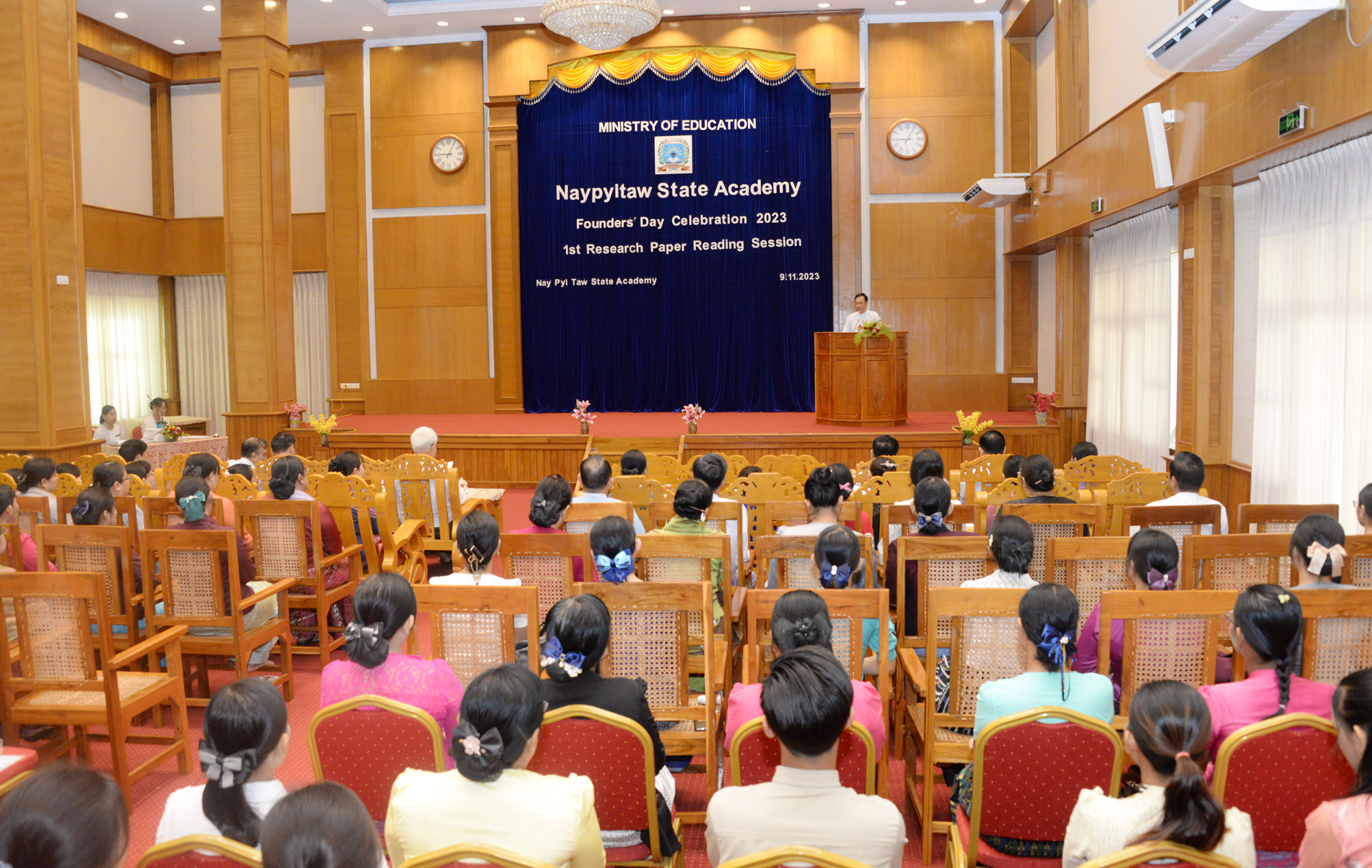 Naypyitaw State Academy တည်ထောင်သည့် (၁) နှစ်ပြည့် အထိမ်းအမှတ် စာတမ်းဖတ်ပွဲ ဖွင့်ပွဲအခမ်းအနားကို ယနေ့နံနက် ၉ နာရီတွင် အဆိုပါတက္ကသိုလ်ရှိ ဘွဲ့နှင်းသဘင်ခန်းမ၌ ကျင်းပရာ ပညာရေးဝန်ကြီးဌာန ဒုတိယဝန်ကြီးဒေါက်တာဇော်မြင့်၊ အမြဲတမ်းအတွင်းဝန် ဒေါက်တာစိုးဝင်း၊ ပညာရေးဝန်ကြီးဌာနရှိ ဦးစီးဌာနများမှ ညွှန်ကြားရေးမှူးချုပ်များ၊ Naypyitaw State Academy ဒုတိယပါမောက္ခချုပ်များ၊ ပါမောက္ခ(ဌာနမှူး)များ၊ စာတမ်းဖတ်ကြားမည့် စာတမ်းရှင်များ၊ ဆရာ ဆရာမများနှင့် ဖိတ်ကြားထားသူများ တက်ရောက်ကြသည်။