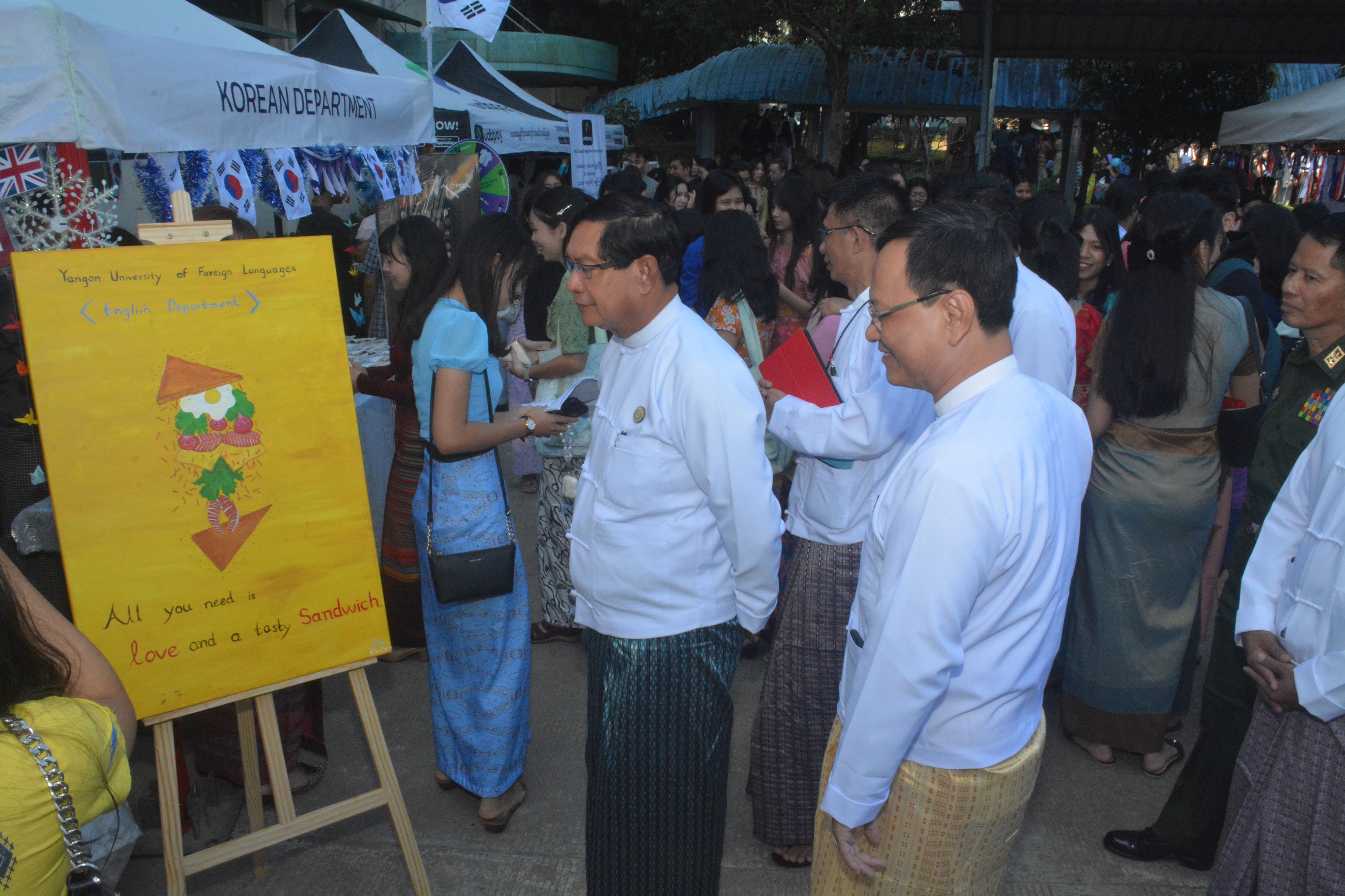ပညာရေးဝန်ကြီးဌာန ဒုတိယဝန်ကြီး ဒေါက်တာဇော်မြင့်သည် ယနေ့နံနက်ပိုင်းတွင် ရန်ကုန်နိုင်ငံခြားဘာသာတက္ကသိုလ် နှစ် (၆၀) ပြည့် အခမ်းအနားသို့ တက်ရောက်ကာ ကျောင်းသား ကျောင်းသူများ၏ အထူးပြုဘာသာစကားအလိုက် ရိုးရာအစားအစာနှင့် အမှတ်တရပစ္စည်း အရောင်းဆိုင်ခန်းများကို လှည့်လည်ကြည့်ရှု အားပေးသည်။