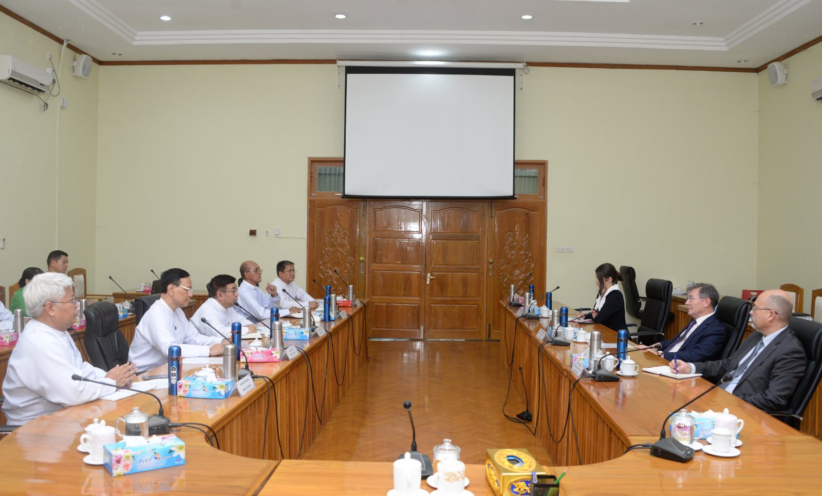 ပညာရေးဝန်ကြီးဌာန ပြည်ထောင်စုဝန်ကြီး ဒေါက်တာညွန့်ဖေသည် ယနေ့မွန်းလွဲပိုင်းတွင် မြန်မာနိုင်ငံဆိုင်ရာ ရုရှားနိုင်ငံသံအမတ်ကြီး H.E. Mr. Iskander Azizov နှင့်အဖွဲ့ကို နေပြည်တော်ရှိ ပညာရေးဝန်ကြီးဌာန ရုံးအမှတ်(၁၃) အစည်းအဝေးခန်းမ၌ လက်ခံတွေ့ဆုံသည်။