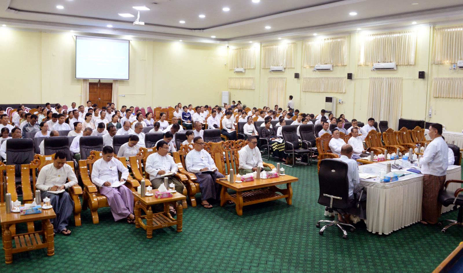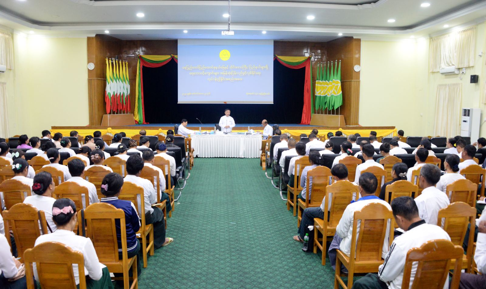 နေပြည်တော် ပြည်ထောင်စုနယ်မြေနှင့် တိုင်းဒေသကြီး၊ ပြည်နယ်များရှိ ရေဘေးသင့်ကျောင်းများ အမြန်ဆုံးပြန်လည်ဖွင့်လှစ်နိုင်ရေး လုပ်ငန်းညှိနှိုင်းအစည်းအဝေးကို ယနေ့မွန်းလွဲပိုင်းတွင် နေပြည်တော် ပညာရေးဝန်ကြီးဌာန ရုံးအမှတ်(၁၃)ရှိ အစည်းအဝေးခန်းမ၌ ကျင်းပရာ ပညာရေးဝန်ကြီးဌာန ပြည်ထောင်စုဝန်ကြီး ဒေါက်တာညွန့်ဖေ၊ ဒုတိယဝန်ကြီးများဖြစ်ကြသည့် ဒေါက်တာဇော်မြင့်နှင့် ဒေါက်တာမိုးဇော်ထွန်း၊ ညွှန်ကြားရေးမှူးချုပ်များ၊ ဒုတိယအမြဲတမ်း အတွင်းဝန်များ၊ နေပြည်တော် ပြည်ထောင်စုနယ်မြေနှင့် ရေဘေးသင့်ခဲ့သော ဒေသများမှ ခရိုင် ပညာရေးမှူးများ၊ မြို့နယ်ပညာရေးမှူးများ၊ ကျောင်းအုပ်ကြီးများနှင့် ဆရာ ဆရာမများ တက်ရောက်ကြသည်။