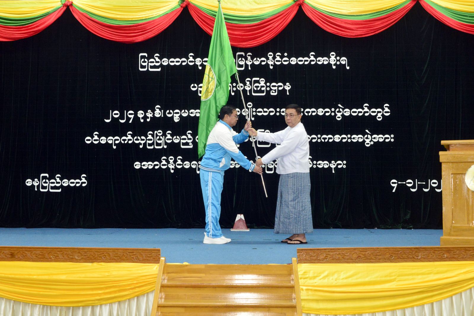 ပညာရေးဝန်ကြီးဌာနအနေဖြင့် အရည်အသွေးပြည့်ဝသော အားကစားသမားများက အားကစားစိတ်ဓာတ်အပြည့်အဝဖြင့် ပြိုင်ပွဲများအားလုံးကို တက်တက်ကြွကြွ ပါဝင်ယှဉ်ပြိုင်ပြီး ကြိုးပမ်းမှုနှင့် ထိုက်ထိုက်တန်တန် အောင်မြင်မှုများ ဆွတ်ခူးရရှိနိုင်မည်ဟုယုံကြည်ပါကြောင်း၊ အားကစားစိတ်ဓာတ်အပြည့်ဖြင့် မဆုတ်မနစ်သော ဇွဲလုံ့လဝီရိယများနှင့် လှေခွက်ချည်းကျန် အလံမလှဲ အားသွန်ခွန်စိုက်ကြိုးပမ်းပါဝင်ယှဉ်ပြိုင်ကြရန် တိုက်တွန်းပါကြောင်း ပြောကြားပြီး ပညာရေးဝန်ကြီးဌာန အားကစားအဖွဲ့များကိုယ်စား အဖွဲ့ခေါင်းဆောင် ပါမောက္ခချုပ် ဒေါက်တာတင်ထွန်းကို အောင်နိုင်ရေးအလံ အပ်နှင်းသည်။