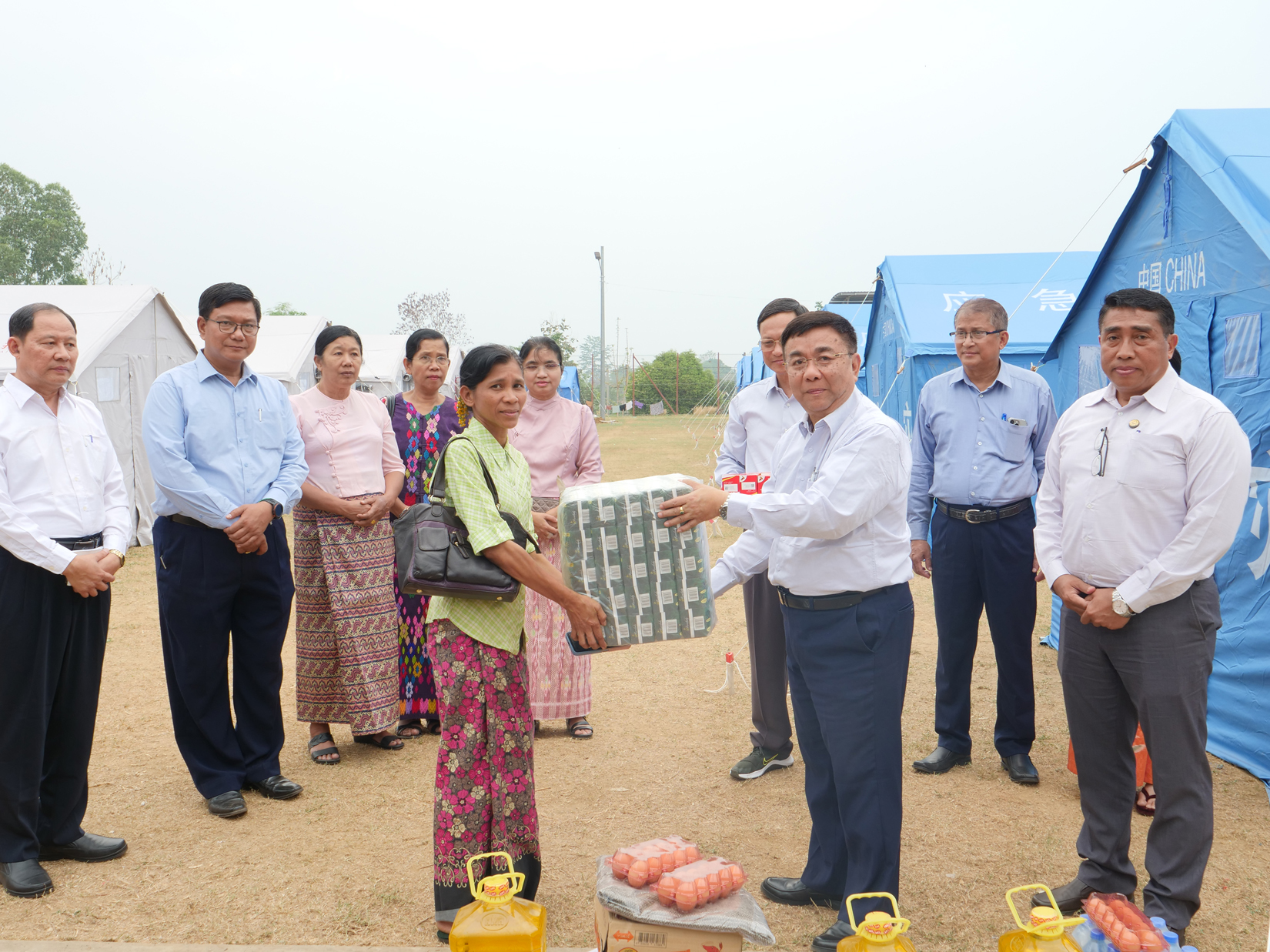 ဆက်လက်၍ ပြည်‌ထောင်စုဝန်ကြီးသည် ဇမ္ဗူသီရိမြို့နယ် အမှတ်(၉) အခြေခံပညာ အထက်တန်းကျောင်းရှိ ယာယီငလျင်ရှောင်စခန်းသို့ သွားရောက်ကြည့်ရှုစစ်ဆေး၍ ငလျင်ဒဏ် သင့် ဝန်ထမ်းများအား စားသောက်ကုန်၊ လူသုံးကုန်နှင့် ထောက်ပံ့ငွေများကို လက်ဝယ်အရောက် ဖြန့်ဝေပေးအပ်ခဲ့ကြောင်း သိရသည်။