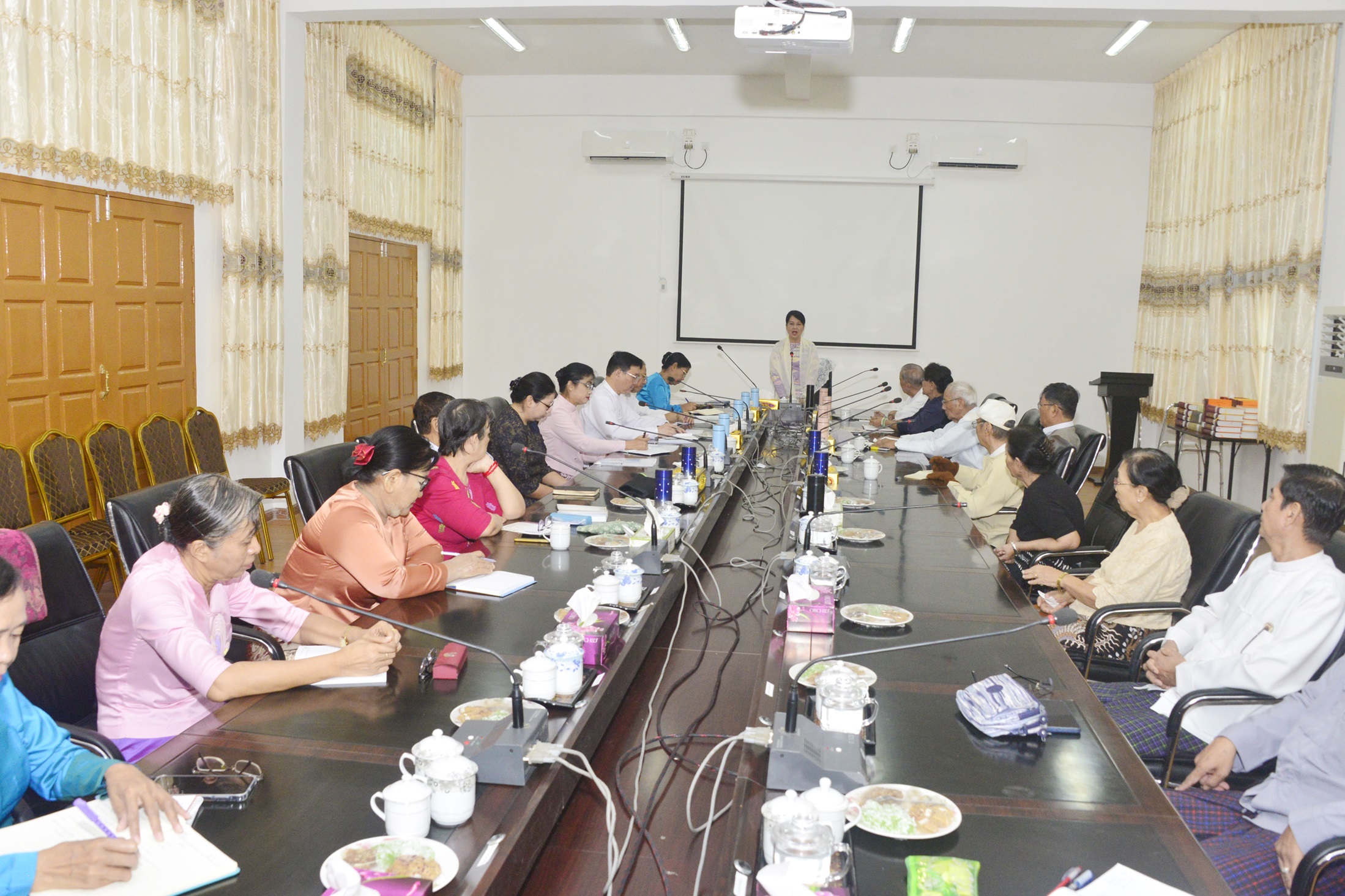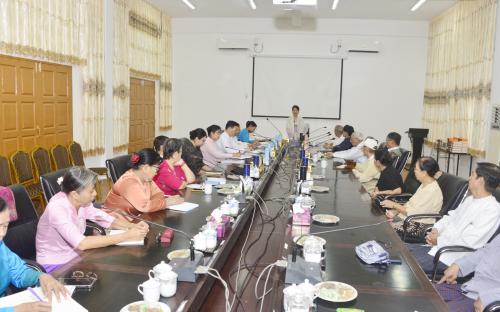 ထို့နောက် မြန်မာနိုင်ငံတိုင်းရင်းသားဘာသာစကားဦးစီးဌာန ညွှန်ကြားရေးမှူးချုပ် ဒေါက်တာသန့်စင်အေးက မြန်မာစာအဖွဲ့၏လုပ်ငန်းဆောင်ရွက်နေမှုများကိုလည်းကောင်း၊ မြန်မာစာအဖွဲ့ဝင် ဆရာကြီး ဆရာမကြီးများက ဆောင်ရွက်လျက်ရှိသည့် အဘိဓာန်ပြုစုရေးလုပ်ငန်း ဆောင်ရွက်နေမှုများကိုလည်းကောင်း ဆွေးနွေးတင်ပြကြသည်။