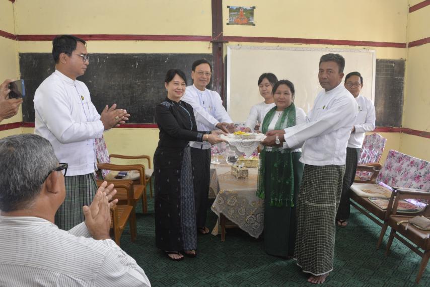 ဆက်လက်၍ ပြည်ထောင်စု၀န်ကြီး၊ ဒုတိယ၀န်ကြီးနှင့် တာ၀န်ရှိသူများသည် ဧရာ၀တီတိုင်းဒေသကြီး မြန်အောင်ခရိုင် ကနောင်မြို့ အခြေခံပညာအထက်တန်းကျောင်း၌ Grade-12 ကျောင်းသား ကျောင်းသူများနှင့် တွေ့ဆုံအားပေးစကားပြောကြားပြီး ကျောင်းအုပ်ကြီး၊ ဆရာ ဆရာမများ၊ မြို့မိမြို့ဖများ၊ ကျောင်းသားမိဘများနှင့် တွေ့ဆုံရာတွင် ကျောင်းသား ကျောင်းသူများ အဆင်ပြေချောမွေ့စွာ စာမေးပွဲဖြေဆိုနိုင်ရေး၊ Grade-12 အောင်ချက်ရာခိုင်နှုန်း မြင့်မားရေးအတွက် လာရောက်အားပေးခြင်းဖြစ်ကြောင်း၊ ကျောင်း၏လိုအပ်ချက်များကိုသိရှိပြီး အတတ်နိုင်ဆုံး ပံ့ပိုး ဖြည့်ဆည်းပေးသွားမည်ဖြစ်ကြောင်း ပြောကြားကာ ကျောင်းအတွက်ချီးမြှင့်ငွေများကို ကျောင်းအုပ်ကြီးထံ ပေးအပ်သည်။