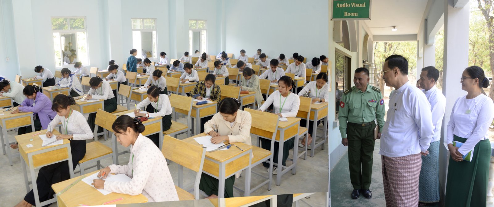 ပညာရေး၀န်ကြီးဌာန ဒုတိယ၀န်ကြီးဒေါက်တာဇော်မြင့်သည် တာဝန်ရှိသူများနှင့်အတူ ယနေ့နံနက်ပိုင်းတွင် မိတ္ထီလာမြို့ရှိ မိတ္ထီလာတက္ကသိုလ်၊ မိတ္ထီလာစီးပွားရေးတက္ကသိုလ်နှင့် မိတ္ထီလာပညာရေးဒီဂရီကောလိပ်များတွင် စာမေးပွဲဖြေဆိုကြမည့် တက္ကသိုလ်ကျောင်းသား ကျောင်းသူများအား ရင်းရင်းနှီးနှီးတွေ့ဆုံ အားပေးစကားပြောကြားကာ ပထမနေ့တက္ကသိုလ်စာမေးပွဲ စိတ်အေးချမ်းစွာ ဖြေဆိုနေမှုကို လှည့်လည်ကြည့်ရှုသည်။