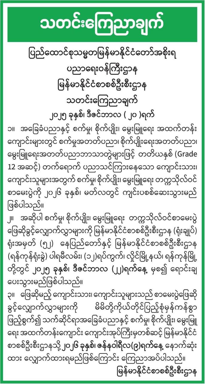 မြန်မာနိုင်ငံဝိဇ္ဇာနှင့် သိပ္ပံပညာရှင်အဖွဲ့၏ (၂၅) ကြိမ်မြောက် ငွေရတုသုတေသနညီလာခံနှင့် သိပ္ပံပွဲတော် (၂၀၂၆) ဆုချီးမြှင့်ပွဲကို ယနေ့မွန်းလွဲပိုင်းတွင် ရန်ကုန်တက္ကသိုလ်သုတေသနနှင့် ဆန်းသစ်တီထွင်မှုစင်တာ၌ ကျင်းပသည်။