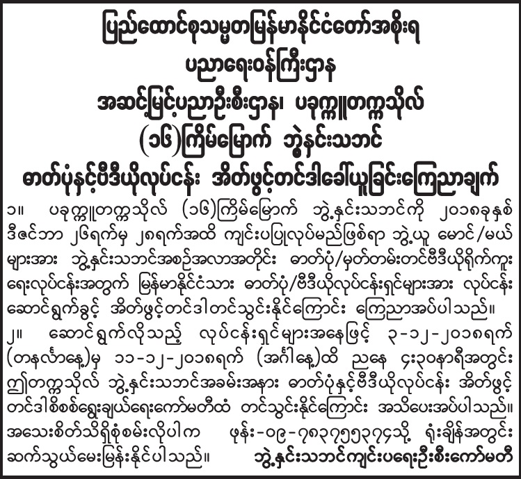 ပခုက္ကူတက္ကသိုလ် (၁၆)ကြိမ်မြောက်ဘွဲ့နှင်းသဘင် ဓာတ်ပုံနှင့်ဗီဒီယိုလုပ်ငန်း အိတ်ဖွင့်တင်ဒါခေါ်ယူခြင်း Type: တင်ဒါကြေညာချက်များ