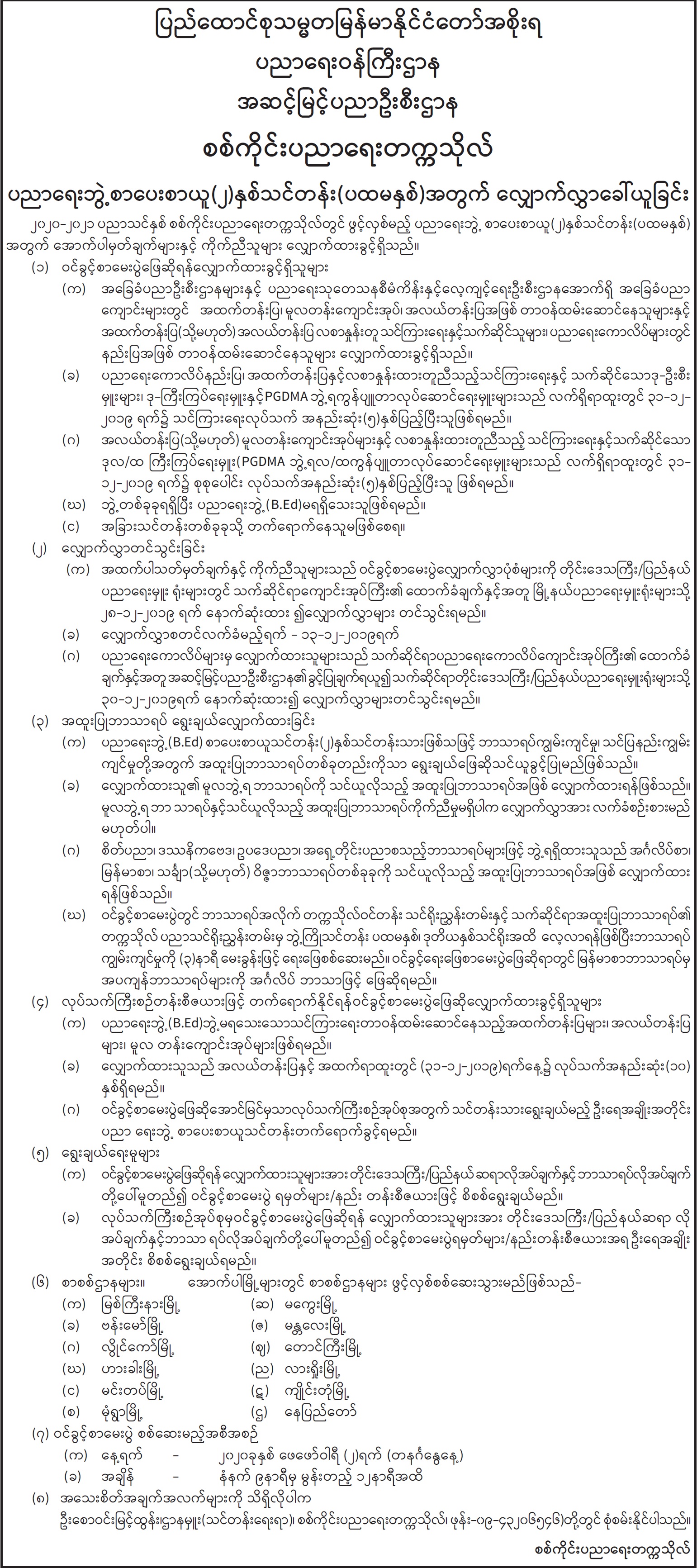 စစ်ကိုင်းပညာရေးတက္ကသိုလ် ပညာရေးဘွဲ့ စာပေးစာယူ(၂)နှစ်သင်တန်း (ပထမနှစ်) အတွက် လျှောက်လွှာခေါ်ယူခြင်း