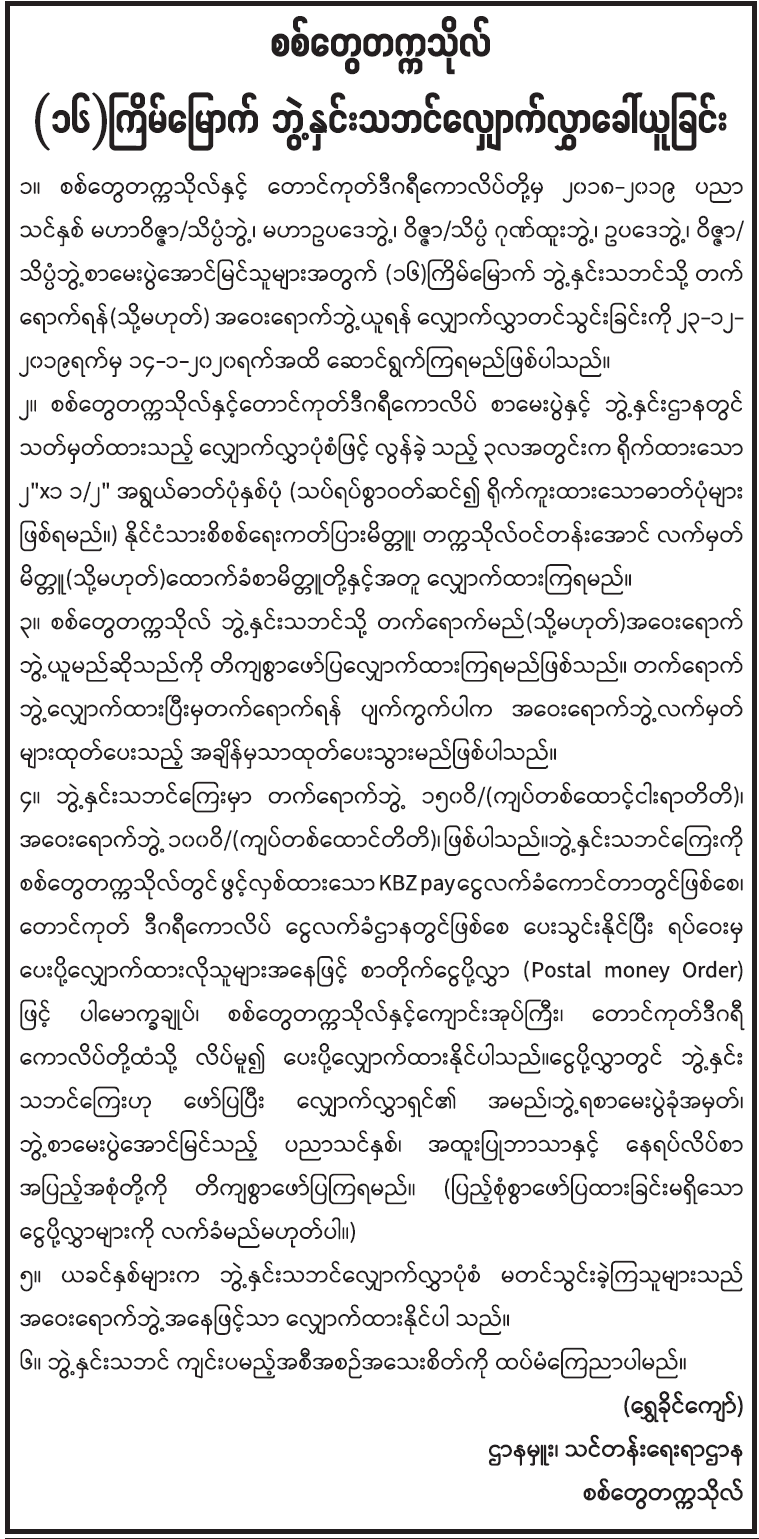စစ်တွေတက္ကသိုလ် (၁၆)ကြိမ်မြောက် ဘွဲ့နှင်းသဘင်လျှောက်လွှာခေါ်ယူခြင်း